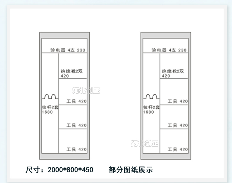 1、柜體是冷軋鋼板卷壓成型,厚度有1.0mm,1.2mm,1.5mm供選擇。柜體表面采用靜電防腐噴塑工藝,顏色為駝灰色,柜門裝有通體透明鋼化玻璃,透過玻璃可以看到分類有序的工器具。