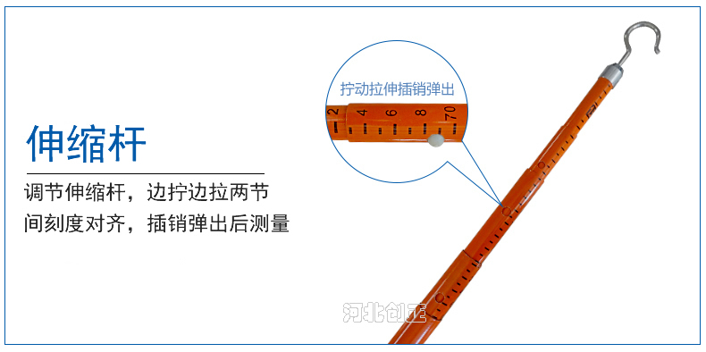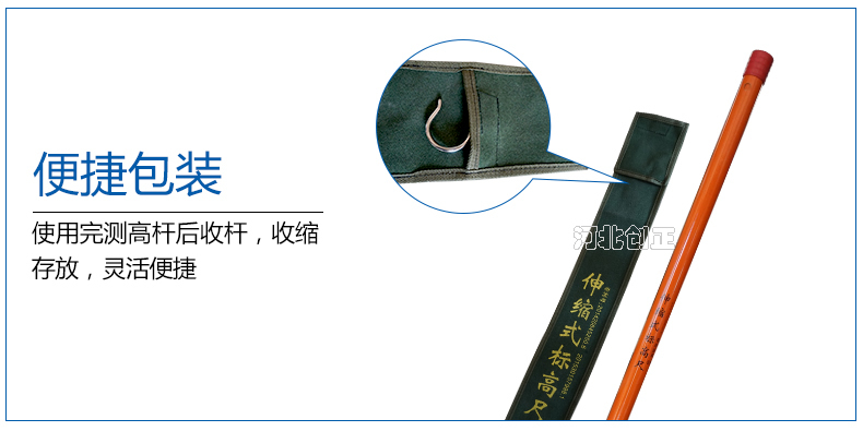 4、測(cè)量時(shí),由內(nèi)層絕緣桿向上抽起,每根絕緣桿的刻度對(duì)應(yīng)外面一層絕緣桿的尺寸刻度,然后旋緊絕緣桿,測(cè)高桿的金屬掛鉤掛在高壓線路上,此時(shí)外側(cè)的絕緣桿上沿對(duì)齊抽起的絕緣桿的刻度;